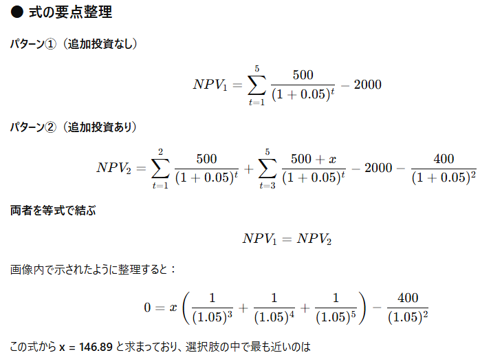 - キャッシュフローの一致条件を見落とさない:問題は最大利益ではなく、「NPVが等しくなる条件」を問うている点に注意が必要です。