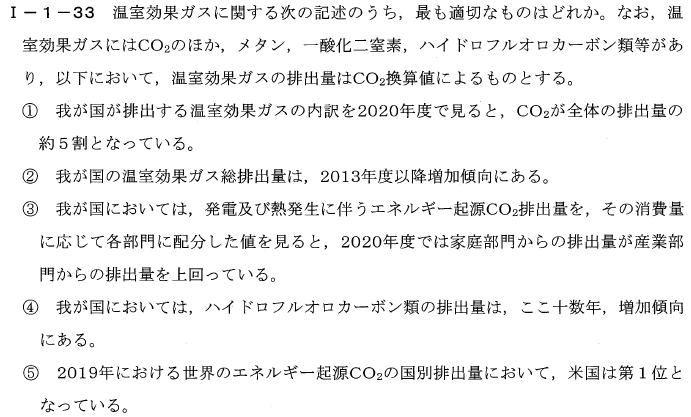 - ⑤ 不正確です。2019年におけるエネルギー起源CO2排出量の国別順位では、中国が第1位であり、米国は第2位です。