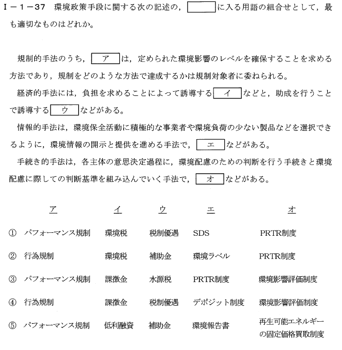 ア(パフォーマンス規制):「パフォーマンス規制」は、特定の環境影響のレベルを達成することを求める手法であり、達成方法については規制対象者に委ねられます。