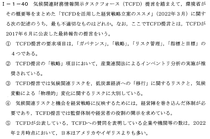 TCFD提言の「戦略」項目では、気候関連のリスクや機会を事業や財務にどのように影響するか評価することが推奨されていますが、具体的に「産業連関法によるインベントリ分析」の実施が求められているわけではありません。
