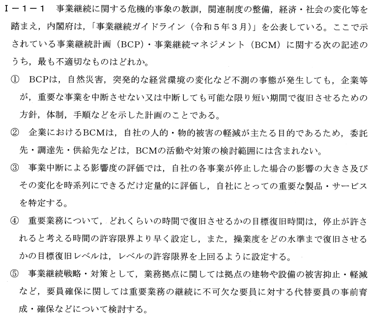 → この記述もBCPの「対策・戦略」フェーズとして正確です。要員の代替確保・拠点の冗長性確保はBCM戦略の要です。