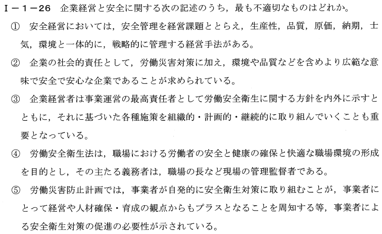 ① 安全を経営課題として統合的・戦略的に管理する考え方 → 適切