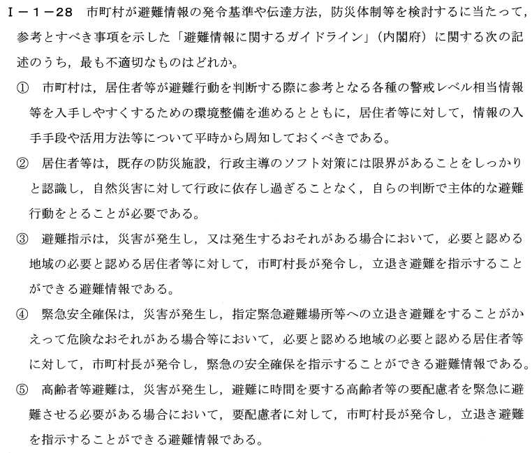 ⑤は、「高齢者等避難」に 避難指示レベル(立退き避難の指示) の内容を含めてしまっており、制度上の整理と一致しません。