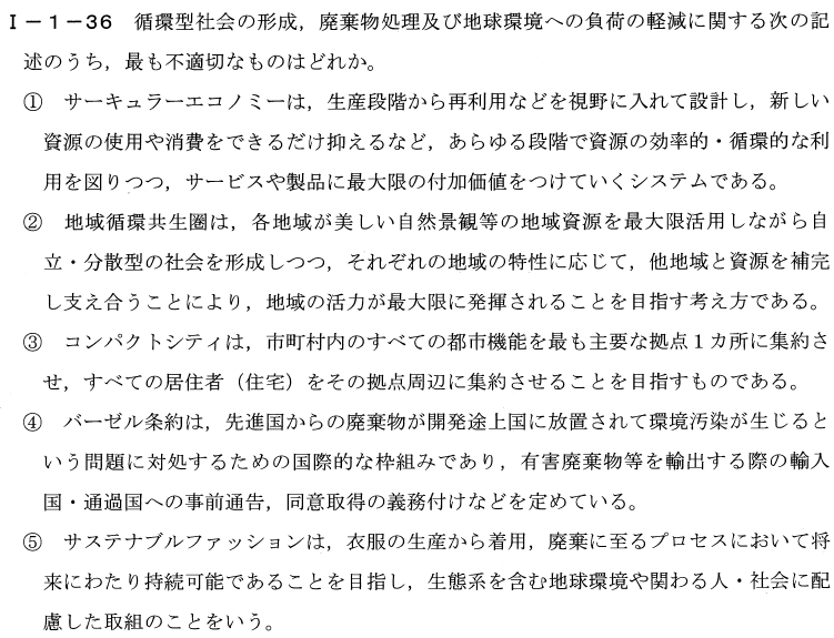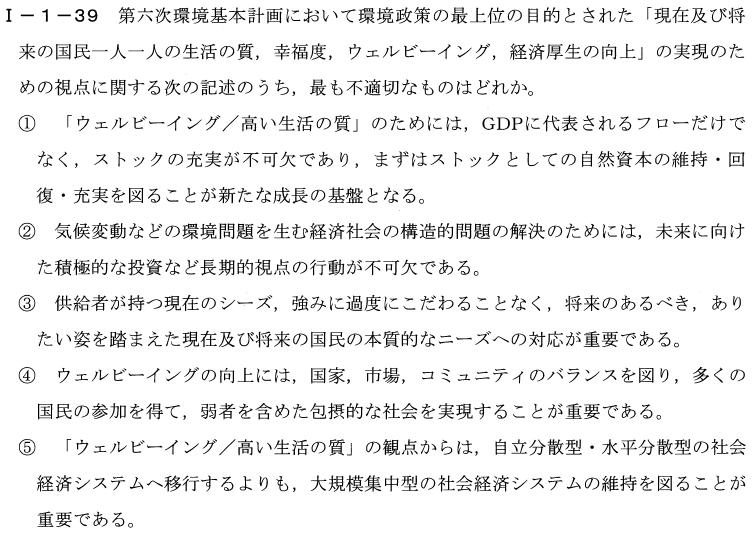 第六次環境基本計画は、「ウェルビーイング/高い生活の質」の実現に向けて、集中型から分散・自立・協働型への転換を重視しており、⑤のように大規模集中型の社会経済システムの維持を重視する趣旨とは整合しません。